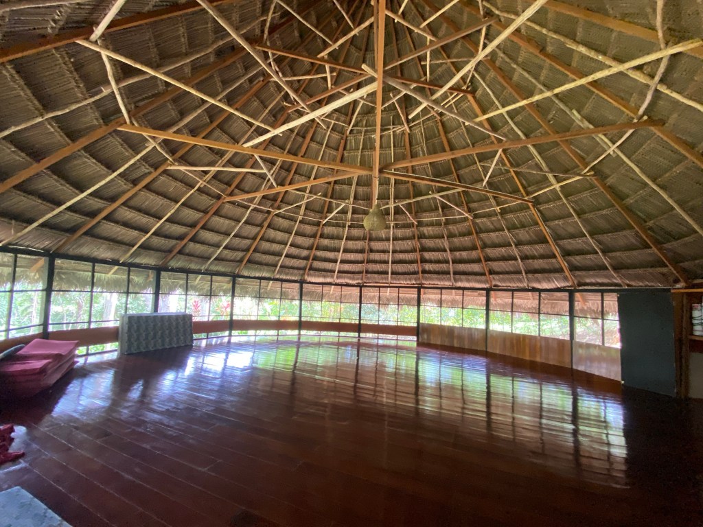 When Donna was ready for me, her boyfriend came to pick me up. I followed him outside to meet Donna. Donna was a petite woman with gray hair pulled into a messy ponytail. She had a sleeveless purple shirt, capris, and no shoes. I followed her to a small maloca (a circular building with wooden supports in the shape of a hexagon). She said I could take off my shoes, which I did.