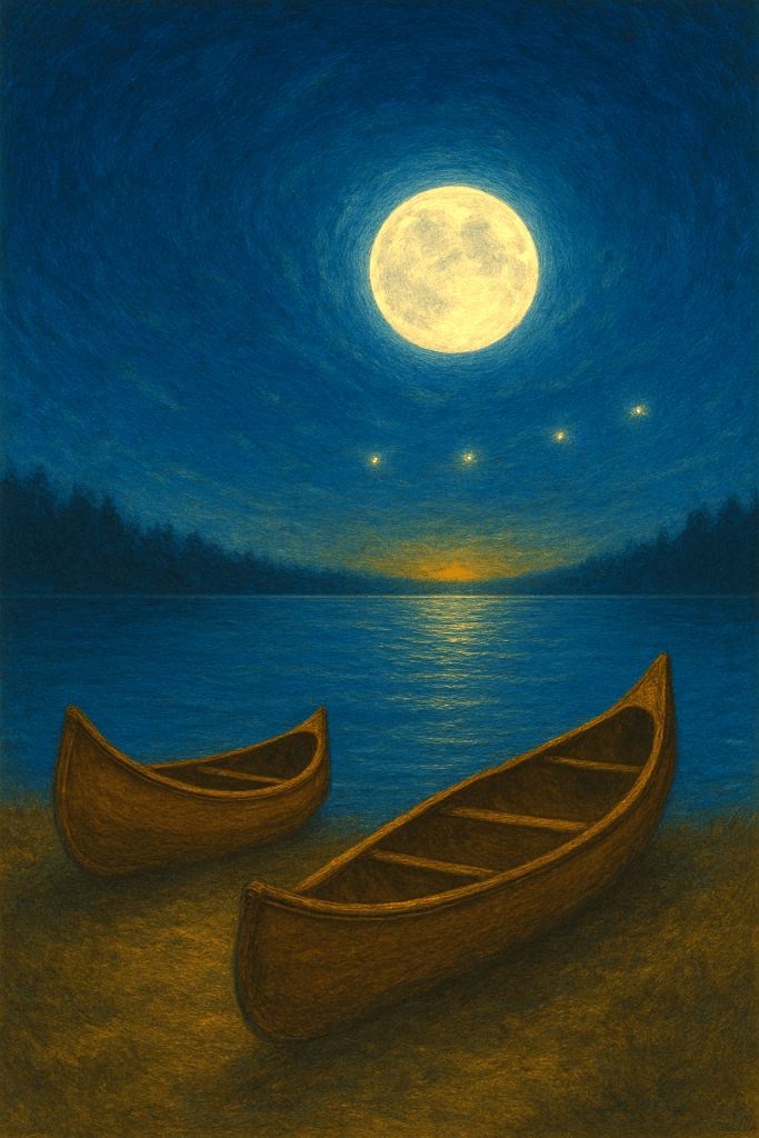 Mother prepares a canoe. The canoe is ready to bring me across the lake to a new land, a new life. I ride alone with the pull of the magnetic moon. I feel the blue waves pressing. I see the illuminated darkness around me. I am drawn toward the bright light. I am not afraid. I arrive in the new land with my head first and a demanding voice. Then I grow every day, and I look at the shining moon above. I see the yellow sun set on the horizon each night. I experience life. Then, one day, Mother prepares a canoe. It’s ready with love to take me back across the waters to the other side. I ride alone. I am not afraid. The shimmering moon pulls me back toward the night sky. The white lights guide my way.